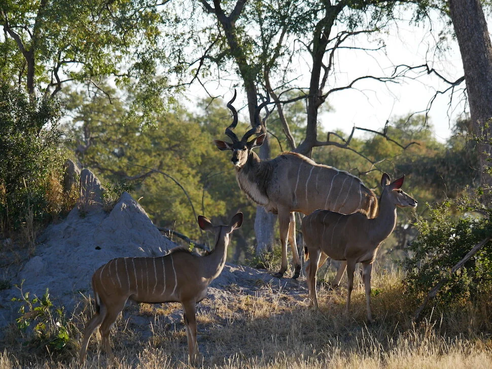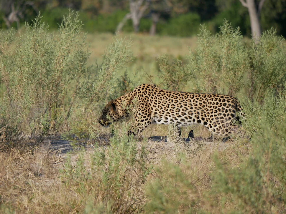 Im Gomoti Plains Camp erwarteten uns 8 Zelte auf Holzdecks. Somit waren max. 16 Personen im Camp, was sich als Glücksfall herausstellen sollte. Wir fühlten uns wie im Film „Jenseits von Afrika!“. Die erste Nacht war ziemlich schlaflos bei morgens dann 7 Grad und diversen Tiergeräuschen. Alle Sinne waren auf höchster Alarmbereitschaft, was ganz normal ist, wie uns Mott erzählte, unser Körper und Geist möchte erstmal nicht hier sein. Aber mit Hilfe eines „Bush-Babys“ (Wärmflasche) haben wir die Nächte gut gewärmt „überlebt“. In der Dunkelheit durften wir nur mit einem Guide zu unserem Zelt gehen und dieses dann auch nicht mehr verlassen. Da es gut sein kann, dass ein Löwe oder ein Hippo einen Abendspaziergang macht und uns mit Futter verwechselt. Die folgenden 3 Tage wurden wir von Eindrücken nur so überwältigt. Stundenlang waren wir immer alleine mit unserem Guide unterwegs, um die Tierwelt zu beobachten. Die Game Drives starteten nach einem Porridge am Lagerfeuer und einer Tasse Café oder Tee am Morgen gegen 6:30 Uhr ohne Hetze und ohne einen Antreiber, der auf Pünktlichkeit pochte. Gegen 9 Uhr und nach den ersten Tierbegegnungen gab es ein kleines weiteres Frühstück mitten im Bush, nur umgeben vom Pfeifen und Gezwitscher der unzähligen Vögel, Knurren der Hippos und Rufen der Elefanten. Nach einer weiteren Exkursion und sinnigen Erläuterungen von Mott kamen wir gegen 11:30 Uhr zurück ins Camp und bekommen eine Art Brunch. Nach einer Mittagspause bis ca. 16 Uhr geht es gestärkt mit Café, Wasser und ein paar Cookies oder Sandwiches wieder auf Tour. Bei unfassbar schönem Sonnenuntergang mit fast 180° „Spannweite“ gab es täglich das Bush Spezial: Gin Tonic mit getrocknetem Gnu-, Kudu- oder Impala-Fleisch. Wieder nur wir Drei und die Natur. Ein grasender Elefant nur ein paar Meter entfernt oder ein ruhender Leopard im Baum: Afrika-Feeling pur. Gleich am ersten Abend verrieten uns dann die Lichter in der Ferne die vermeintliche Nähe zum Camp, aber weit gefehlt. Es war ein Lagerfeuer mitten im Bush und es wurde getanzt, gelacht und ein vorzügliches Essen an einem langen Tisch zusammen mit den Guides serviert. In den nächsten Tagen standen weitere Safaris mit dem Defender, dem Schnellboot und mit dem Mokoro, dem traditionellen Einbaum-Kanu, auf dem Programm. Dabei begegneten uns Löwen, Leoparden, Büffel, Affen, Elefanten, Giraffen, Stachelschweine, Warzenschweine, Kudus, Impalas, Vögel und Hippos. Die Löwen konnte man fast mit der Hand berühren. Im Jeep waren wir in Sicherheit, da die Tier nur die Umrisse des Wagens wahrnehmen. Aber „get out of the car and you are dead“. Unvorstellbar schön… fast unwirklich und eben nicht wie im Zoo.